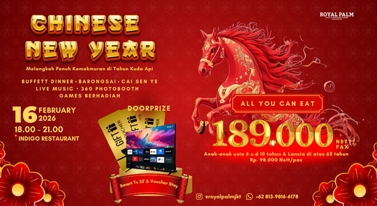Enjoy a meaningful Chinese New Year evening with an All You Can Eat dining experience for only IDR 189,000 nett/pax, complete with live music and lion dance performances. Win exciting door prizes including a One Night Stay Voucher at a Junior Suite Room and a 32-inch Smart TV. Celebrate togetherness with your family, best friends, loved ones, or business partners at Royal Palm Hotel Jakarta.